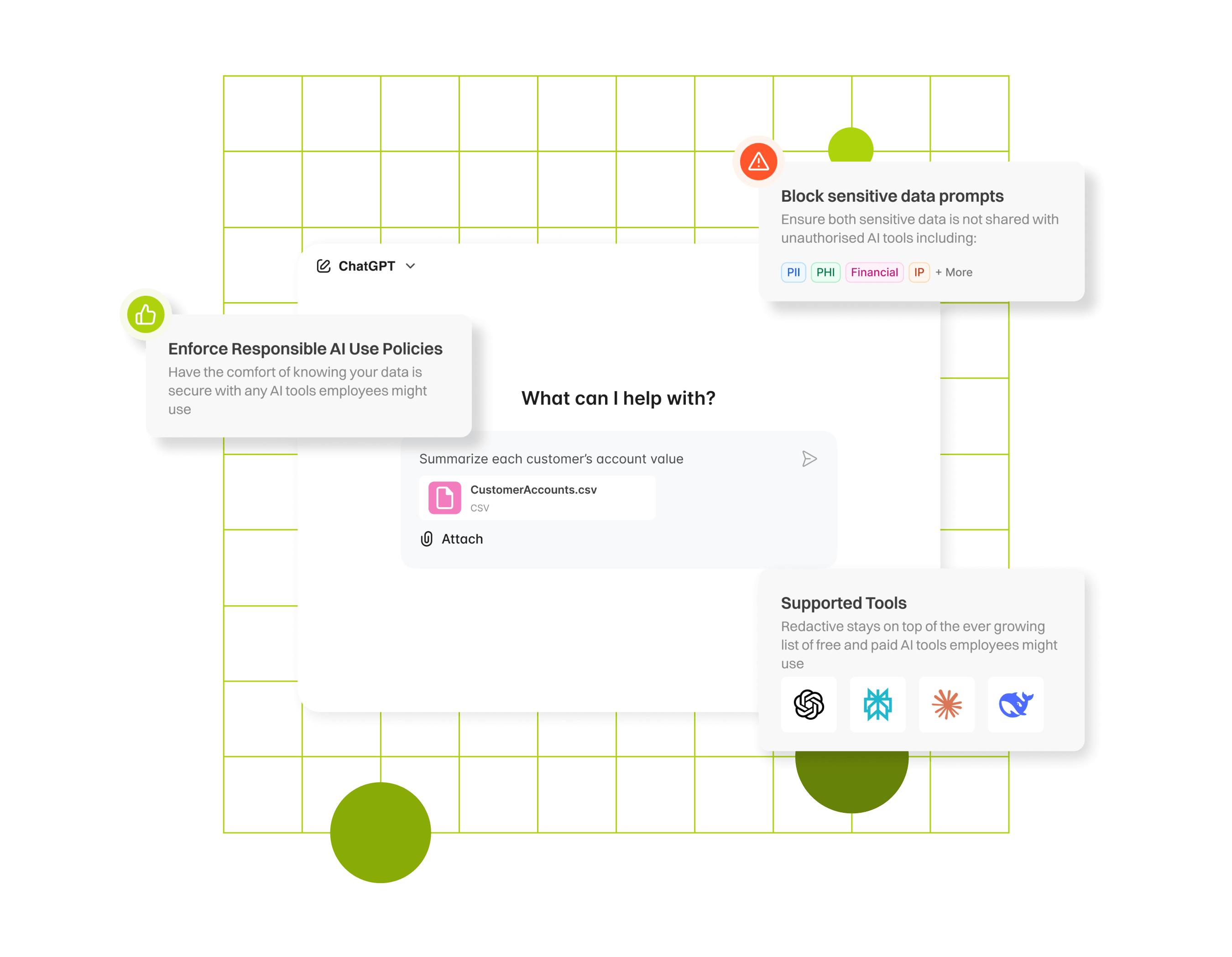 - Redactive's browser plug-in detects and prevents company data from being shared with unauthorized apps such as personal Chat GPT accounts, whilst providing insights into the use cases driving AI usage amongst your employees.