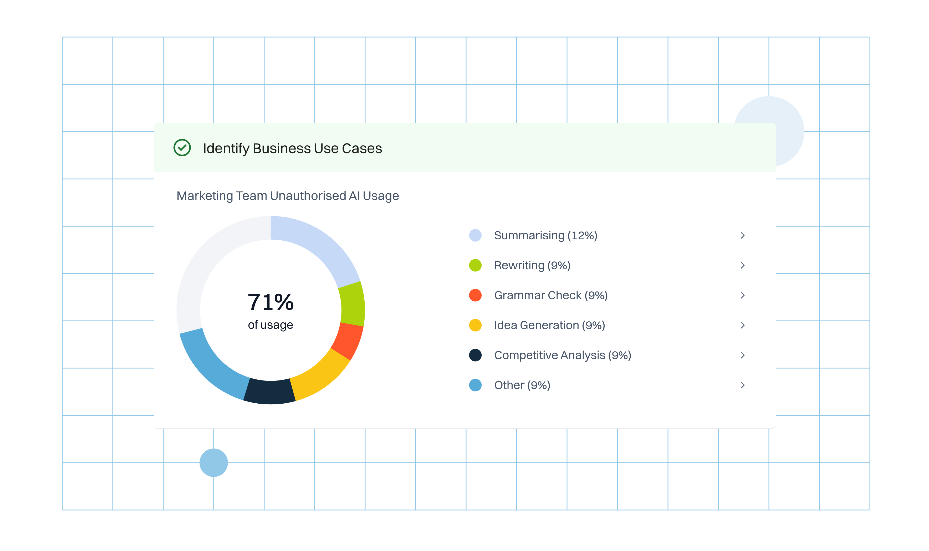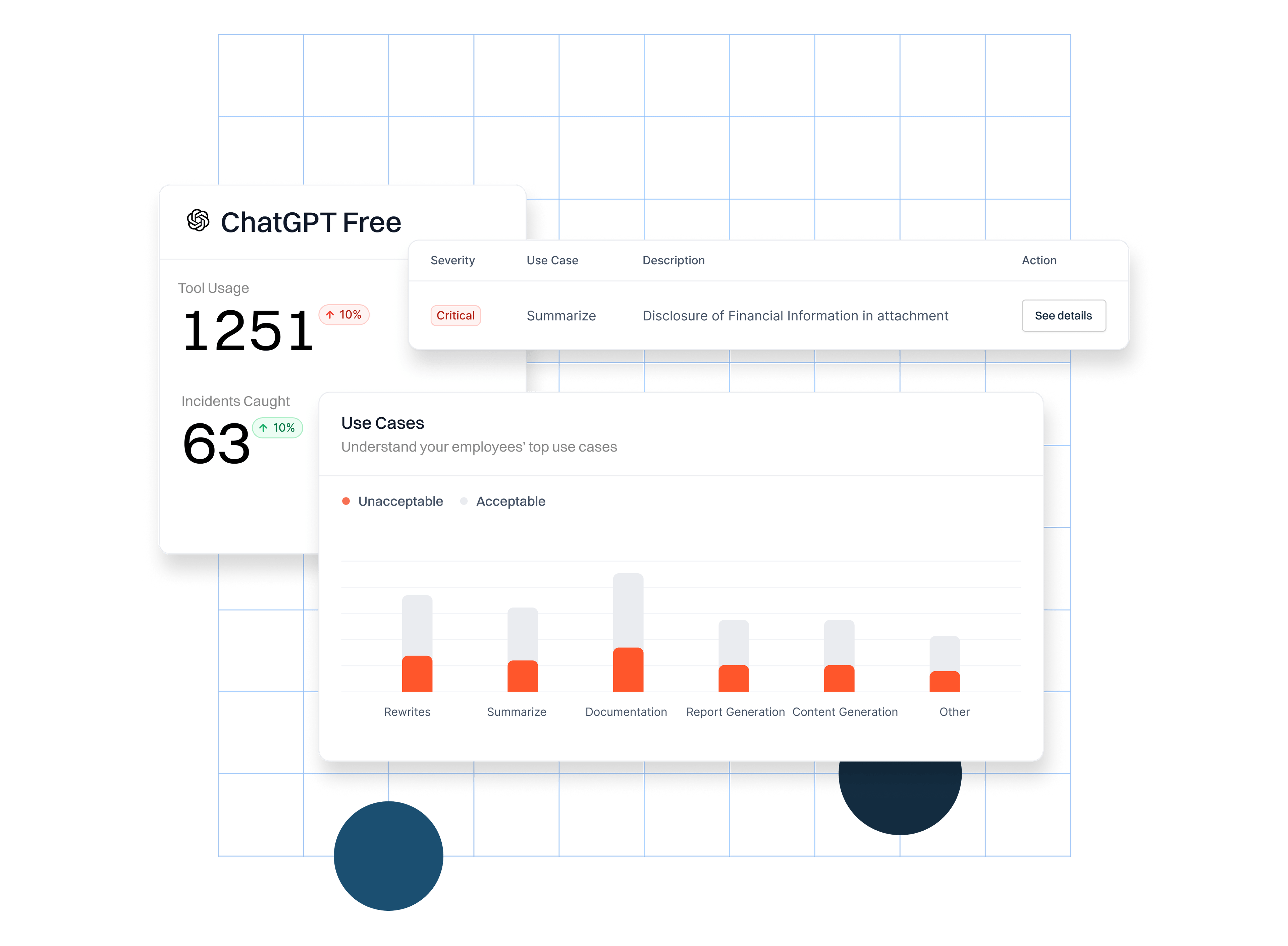 Get insights into the business use cases driving shadow AI usage within your organization, then use these insights to inform your internal AI strategy and acceptable use standards.